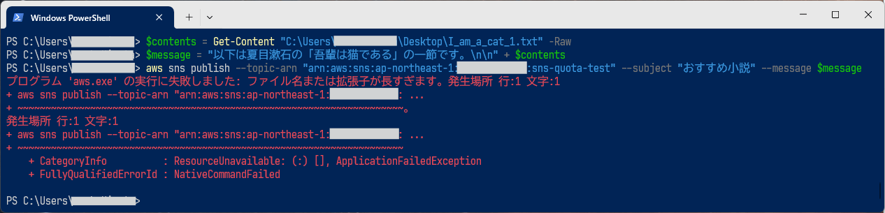 物理コンピュータ(Windows)で所有しているテキストファイルの内容を、Amazon SNSを利用してメールで送る、という作業です。テキストファイルのファイルサイズ(≒文字数)はファイルによって大きく異なります。
