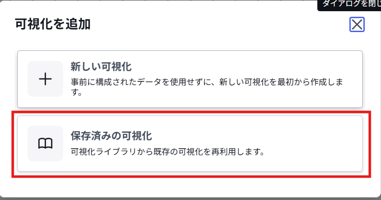 ⑤「データの可視化」をクリックし、「保存済みの可視化」を選択します。