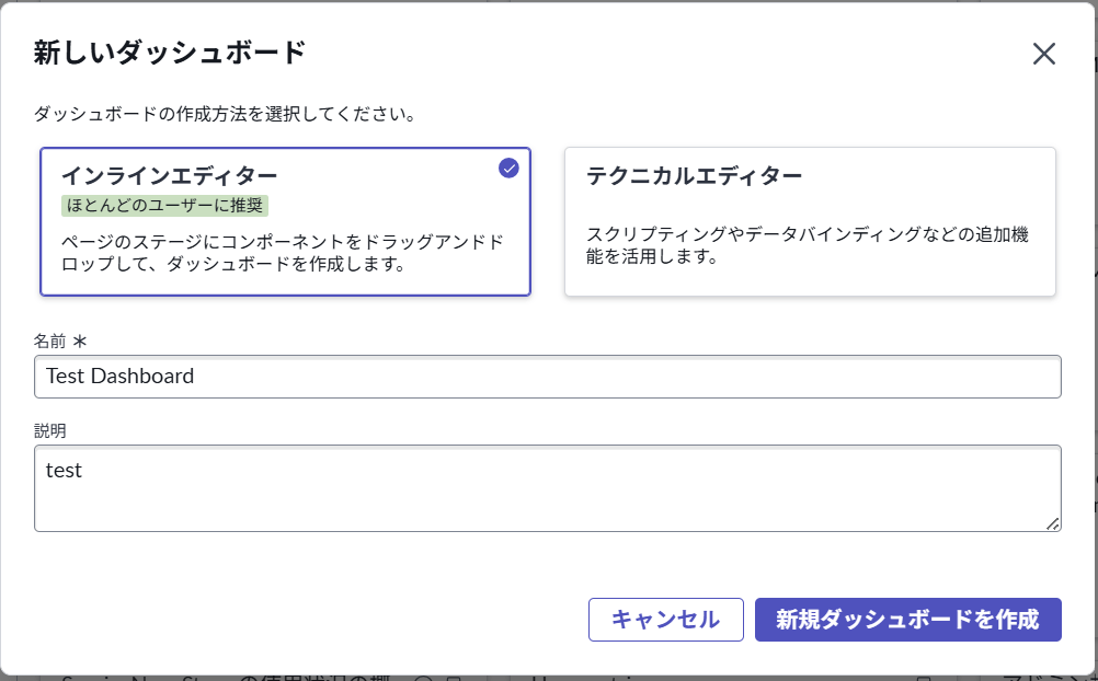 ②「インラインエディター」を選択し、名前と説明を入力し、「新規ダッシュボードを作成ボタン」をクリックします。