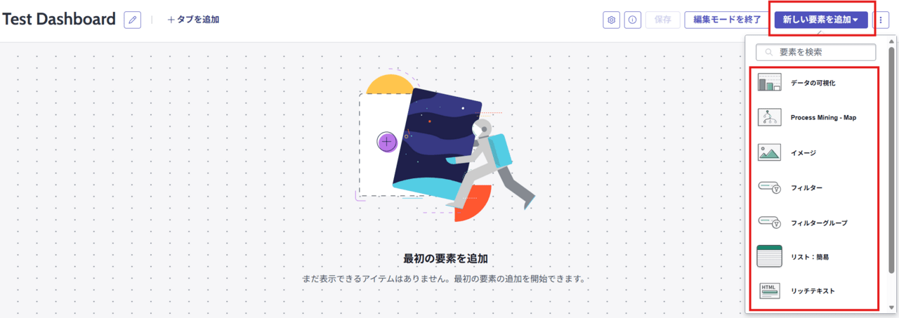 ④「新しい要素を追加」ボタンをクリックし、追加したい要素を選択します。