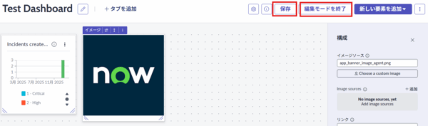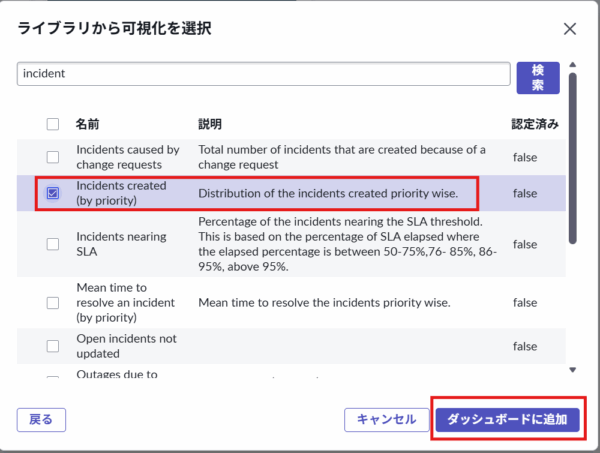 例として「Incident created (by priority)」を選択し、「ダッシュボードに追加」ボタンをクリックします。