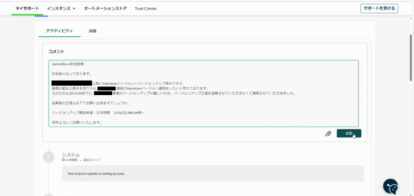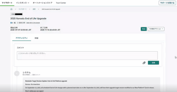 開いた変更スケジュールページのアクティビティタブにバージョンアップが間に合わない旨のメッセージを送ります。