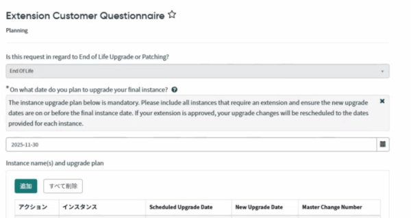 質問は選択肢式の設問が多く、希望延長日時や期限内にバージョンアップできない理由、バージョンアップ計画などについて計22項目聞かれます。また英語での質問・回答になりますのでご注意ください。
