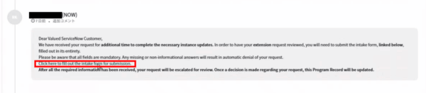こちらにメッセージを送ることでServiceNow担当者が内容を確認し、延長申請フォームのリンクを送ってくれます。