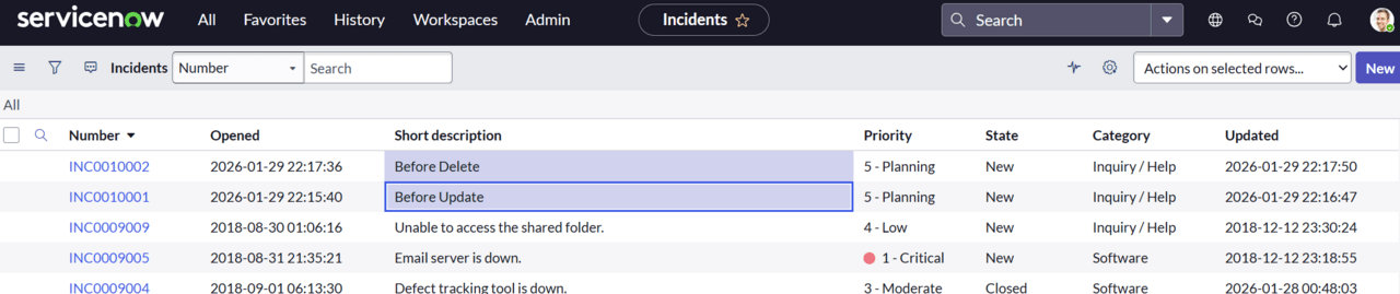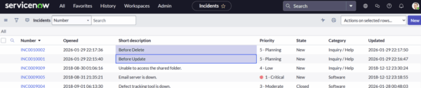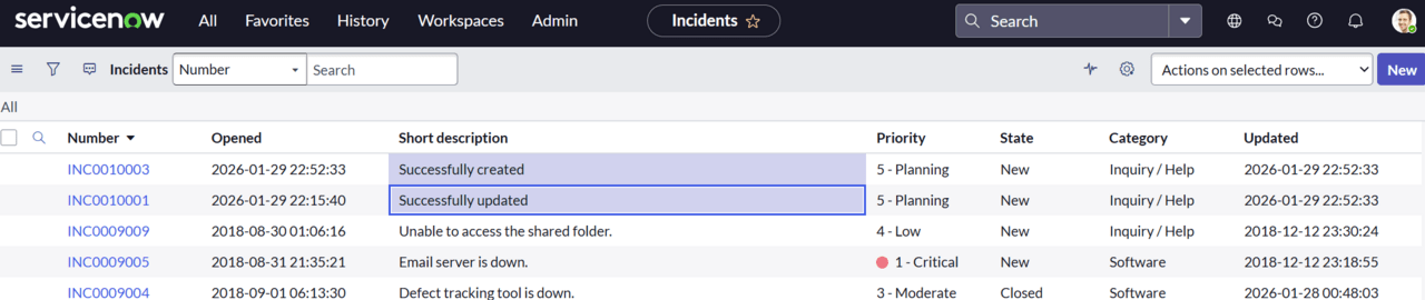 Incidentテーブルを見ると、フローで作成したレコード(Short description: Successfully created)が追加されており、更新用レコードのShort descriptionがBefore updateからSuccessfully updatedに更新されています。