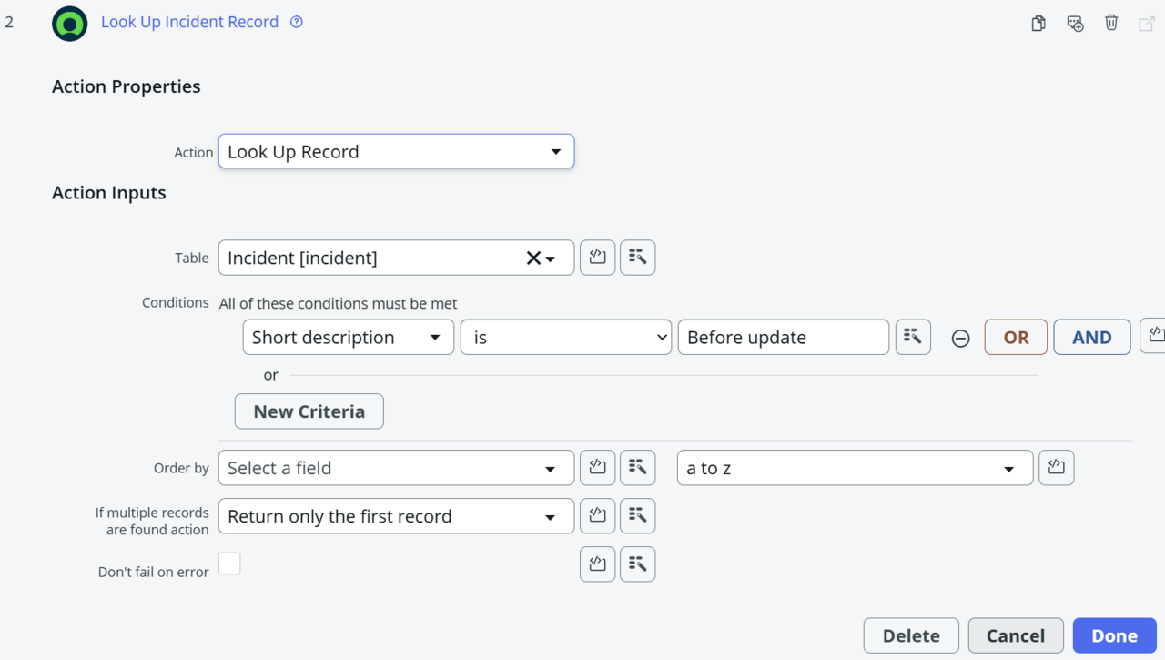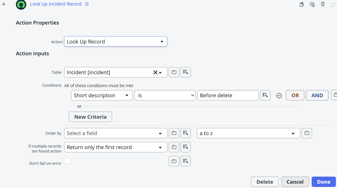 - 事前に作成しておいた削除用レコードを検索するアクション「Look Up Record」を追加。