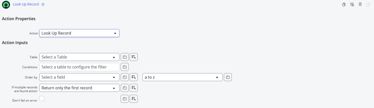 指定したテーブルから条件に合致するレコードを1件取得するアクション。