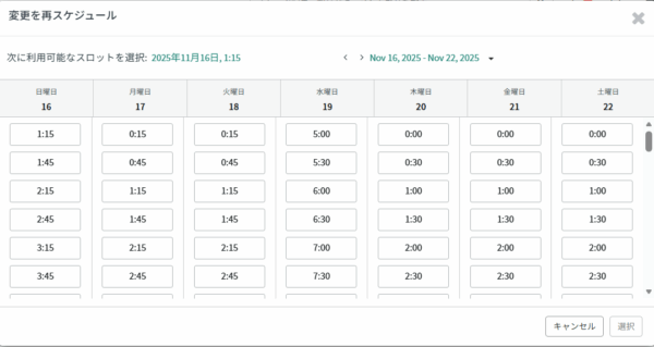 開いた変更スケジュールページの画面上部にある「アップグレードの予定変更」を押下し、候補日時を選択します。