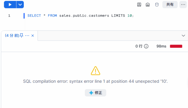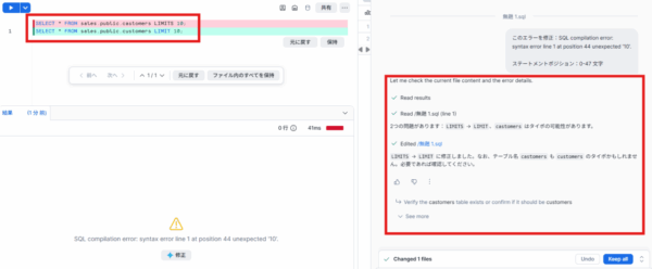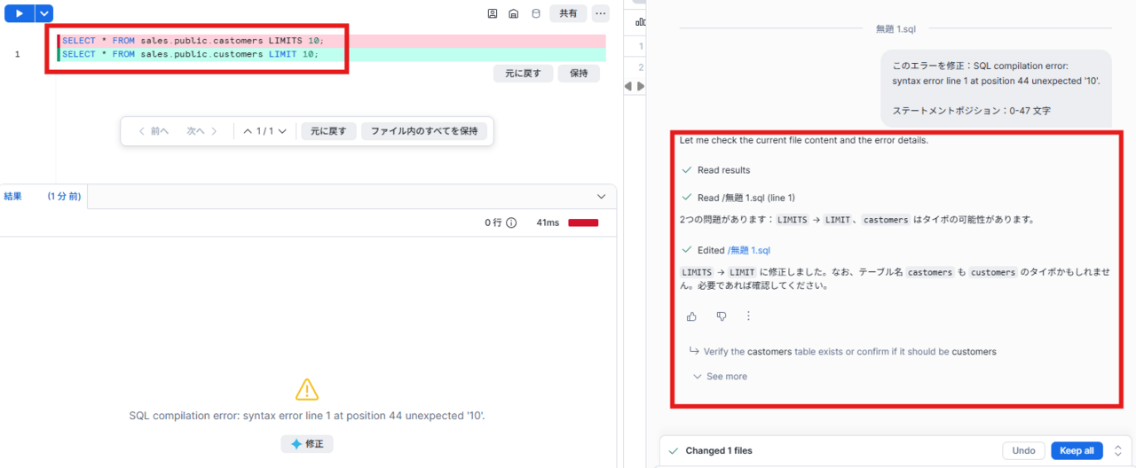 エラー文の下部「修正」をクリックすると、Cortex Codeが正しい回答を教えてくれます。