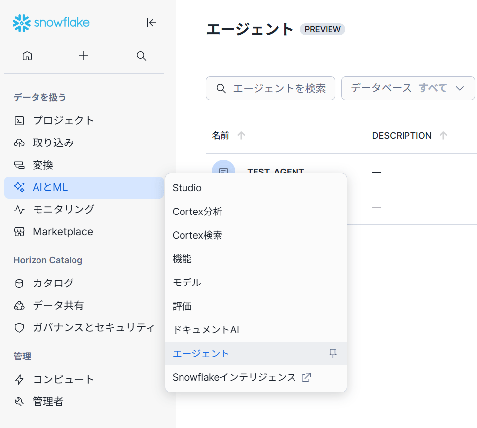 Snowsightで、1.でCREATE権限を付与したロールを指定し、[AIとML>エージェント]メニューに移動してエージェントの作成を行います。