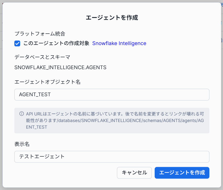 --エージェントの作成権限を付与 GRANT CREATE AGENT ON SCHEMA snowflake_intelligence.agents TO ROLE [エージェント作成者のロール];