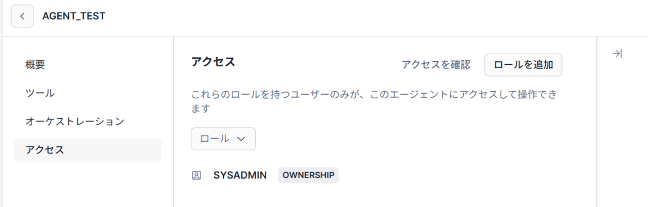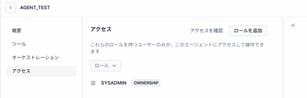 作成時以外のロールにエージェントの利用を許可する場合は、作成したエージェントの編集画面から、[アクセス]メニューを選択してロールの追加を行います。