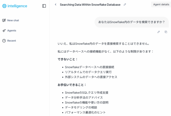 エージェントをただ作成しただけでは、Snowflake上に保管したデータへのアクセスは行ってくれません。