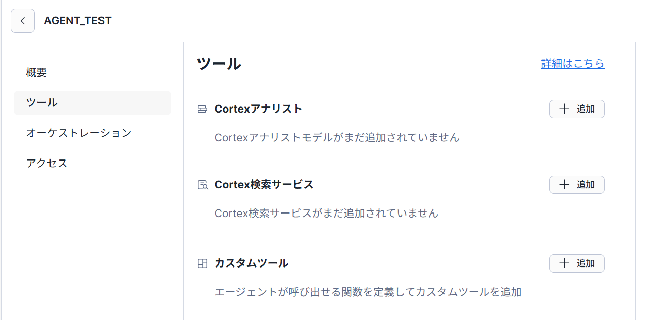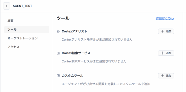 エージェントの編集画面の[ツール]では、従来のSnowflakeのAI機能を紐づけることで、エージェントがどのようにデータへアクセスするかを指定できます。