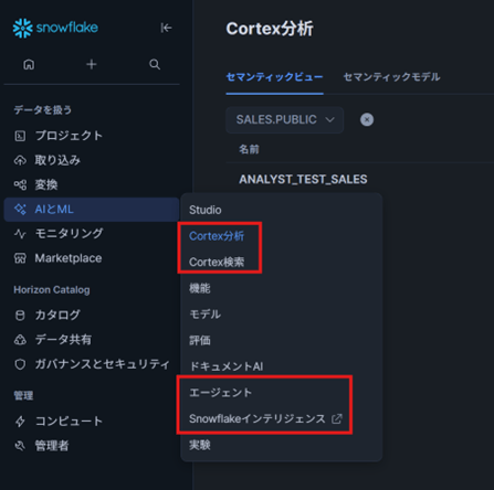 また4つの機能は全て、Snowflakeの[AIとML]からアクセスできます。