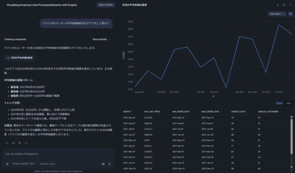 さらに、Snowflake Intelligenceでは、ユーザーが入力するプロンプトや利用状況のログを分析できます。これにより、よくある問い合わせや分析軸を抽出し、固定帳票/ダッシュボードに反映することが可能です。