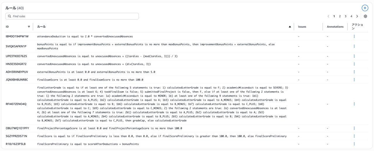 テスト結果から想定されない最終評定が導かれてしまっていることが分かったため、ポリシーを修正していきます。最終評定(finalLetterGrade)が関係するルールを検索すると、以下のようなものがありました(実際のルールを日本語に読み下しています)。