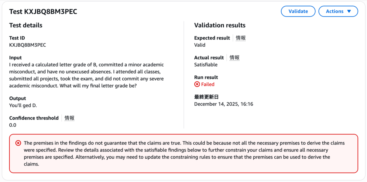 詳細を開くと、どのようなシナリオで失敗しているかを確認することができます。今のルールでは、与えられた条件から、今回はDで確定されるべきfinalLetterGradeがBとなりうると導かれてしまっているようです。
