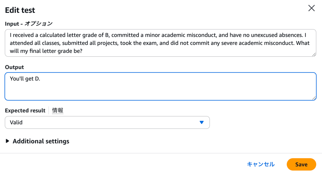今回は次のようなテストケースを作成しました。軽微な不正行為により、成績が最大でもDになるというシナリオです。