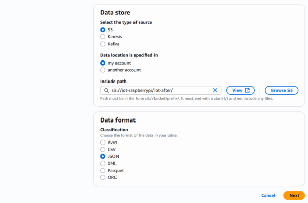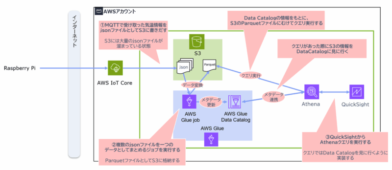 Raspberry Piで取得した気温・湿度のデータがAWS IoT Core等を通じて既にS3に入っている前提で、そのデータを加工していきます。