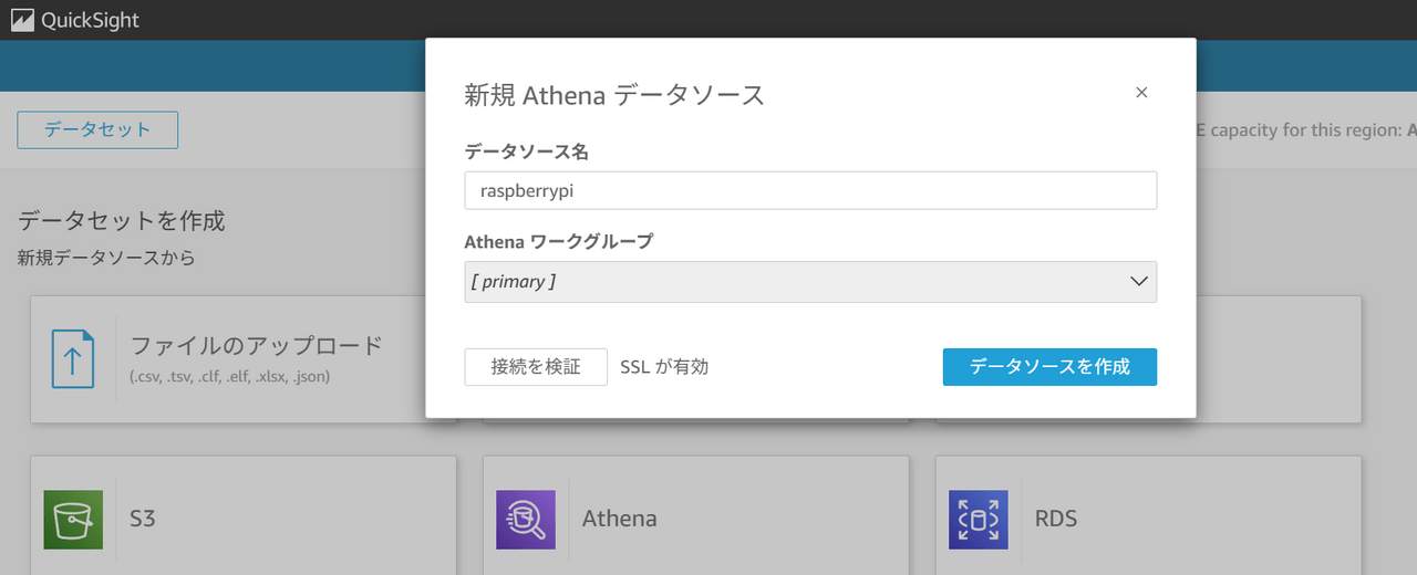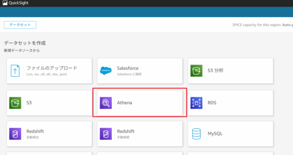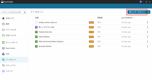 Quicksightアカウントにログインし、データセットタブから「新しいデータセットを作成」をクリックします。