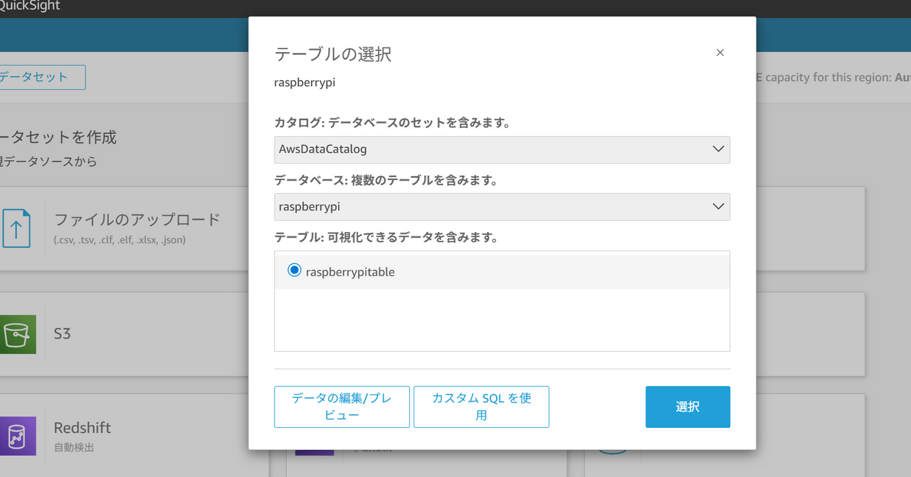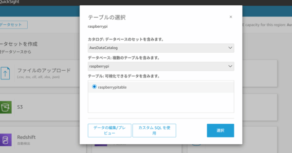 カタログはAwsDataCatalogを選択し、データベースとテーブルは②で作成したものを選択します。