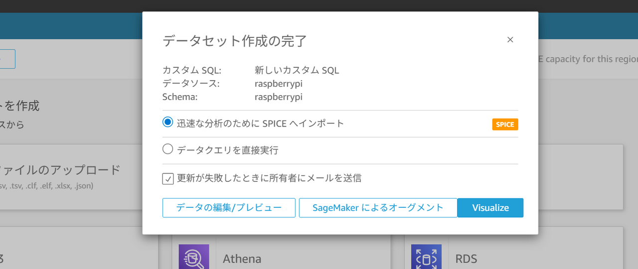 「迅速な分析のためにSPICEへインポート」を選択して「Visualize」をクリックします。