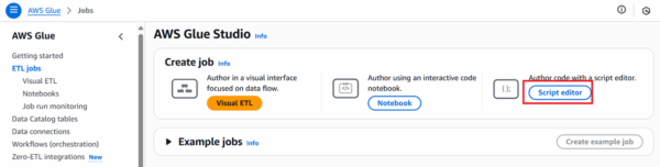 Glueから「Script editor」をクリックし、EngineはSparkを選択して「Create script」をクリックします。