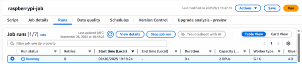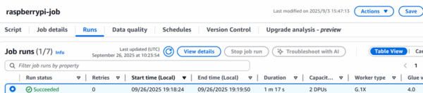右上の「Run」ボタンをクリックします。Job runs一覧に実行した履歴が出力されますので、画面リフレッシュしつつステータスがSuccessになるまで待ちます。