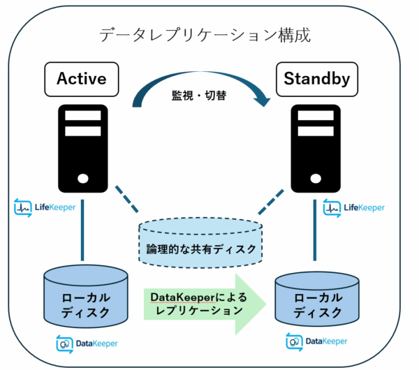 DataKeeperがデータレプリケーションを担い、論理共有ディスク上のデータをそのまま待機系に引き継ぎます。