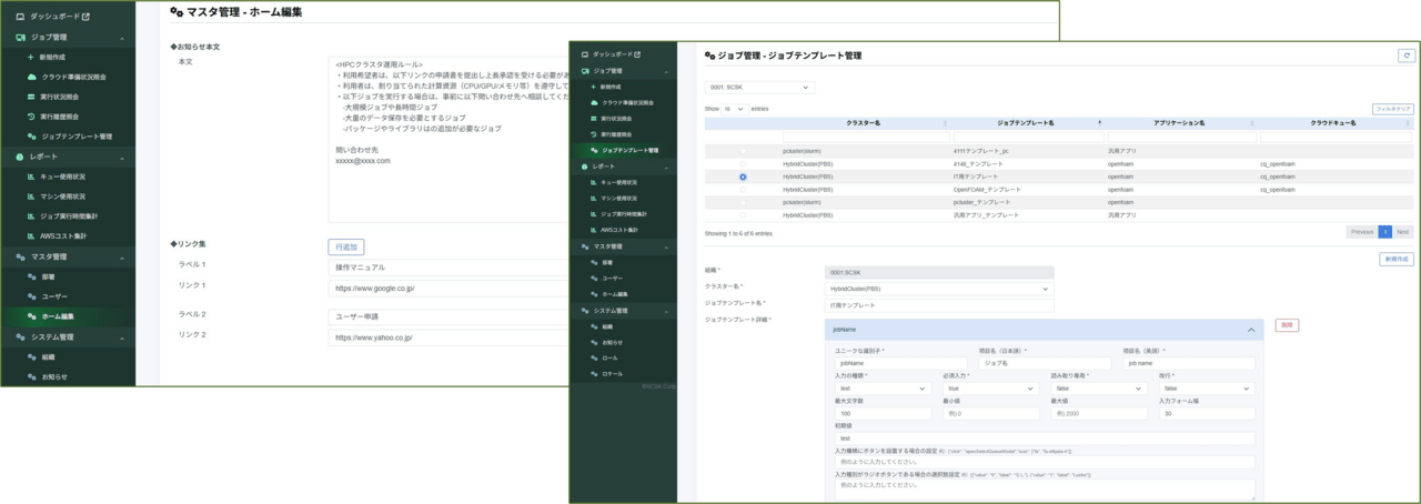管理者向けに、ユーザー情報の作成・変更やジョブテンプレートのメンテナンス機能を提供します。また、お知らせ管理機能により、ユーザー向けのマニュアルやURLリンクを簡単に設置できます。