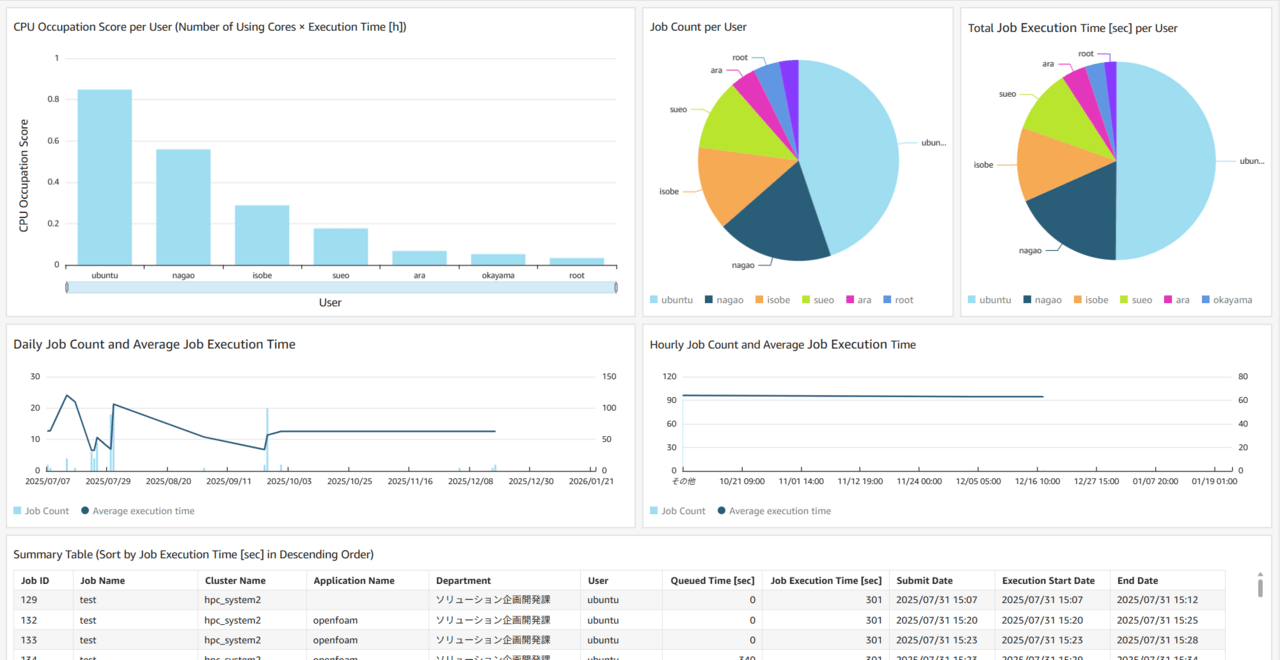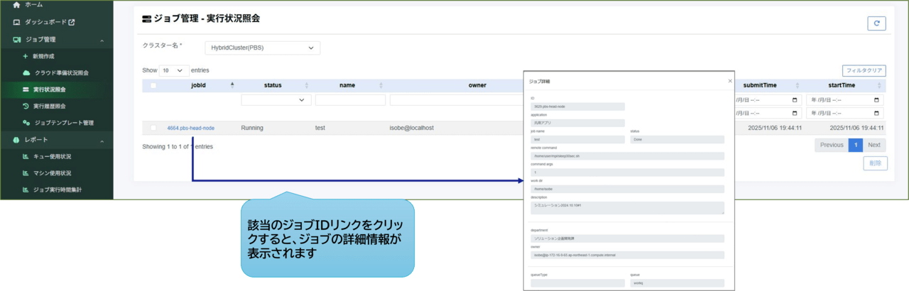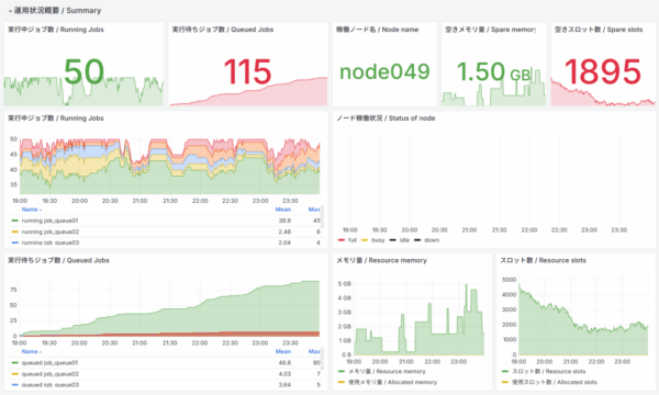 利用者は、現在のリソース使用状況やジョブの混雑状況を、グラフィカルな画面で一目で把握できます。全体の稼働率や空きリソースをリアルタイムで確認可能です。
