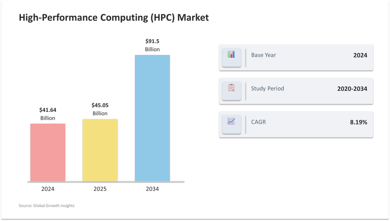 世界的なHPCの市場規模は、2034年までに915億ドル(約14兆6,000億円)に達すると予測されており、需要が急速に伸びています。日本国内に目を向けても、2025年時点で約4,300億円規模に達するとされています。