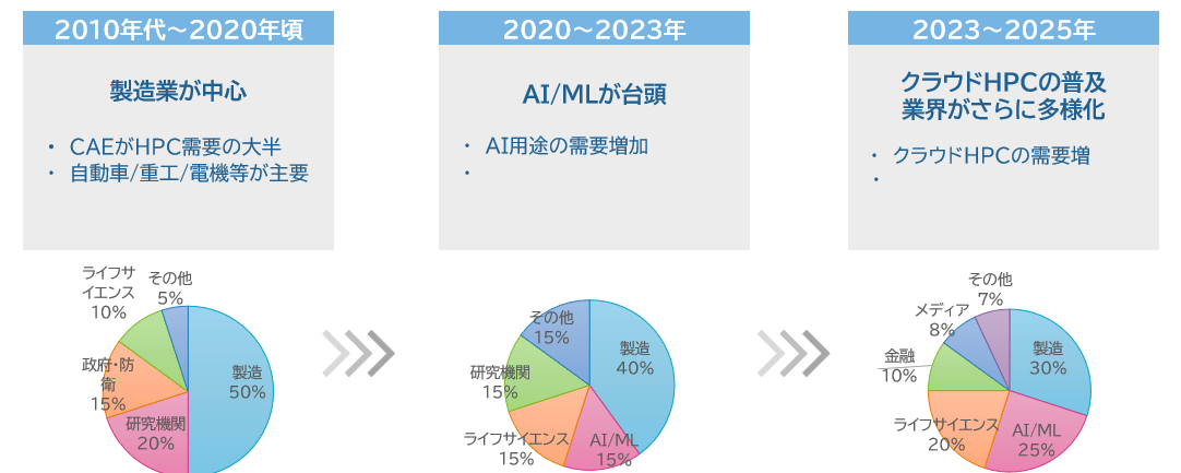 2020年頃までのHPCは、主に自動車や重工業など製造業におけるCAE(コンピュータ活用エンジニアリング)需要が大半を占めていました。しかし現在は、AI・機械学習(ML)が台頭し主役になりつつあります。さらにクラウドHPCの普及により、金融、ライフサイエンス、メディアなど業界がさらに多様化しており、従来の運用方法では対応しきれない新たな課題が生まれています。