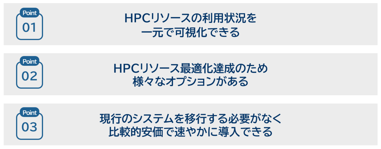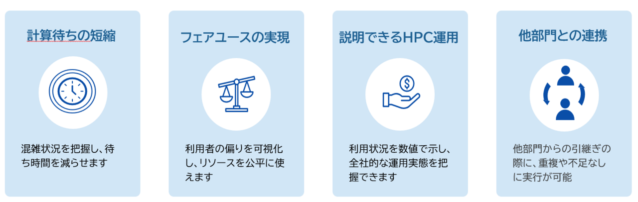 部門ごとではなく全社的に一元管理できれば、「計算待ちの短縮」「フェアユースの実現(リソースの公平な利用)」「説明可能なHPC運用(経営層への数値提示)」「他部門とのスムーズな連携」が可能となり、全社最適が促されます。