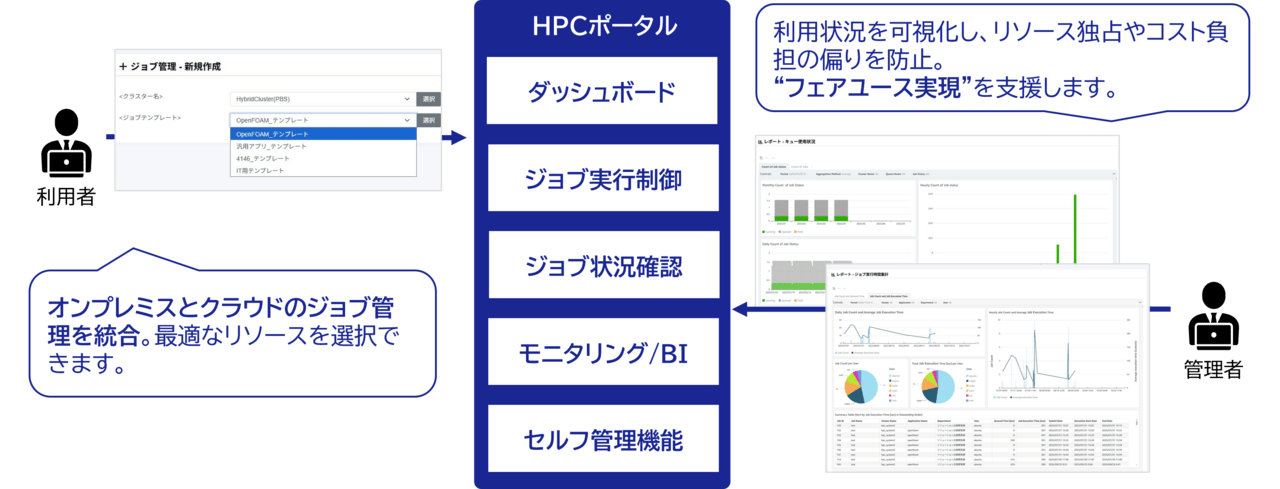 HPC Viewのポータル機能は、直感的に利用可能なGUIベースで提供されます。オンプレミスとクラウドのジョブ管理を統合し、最適なリソースの選択が可能です。以下に主な5つの機能をご紹介します。