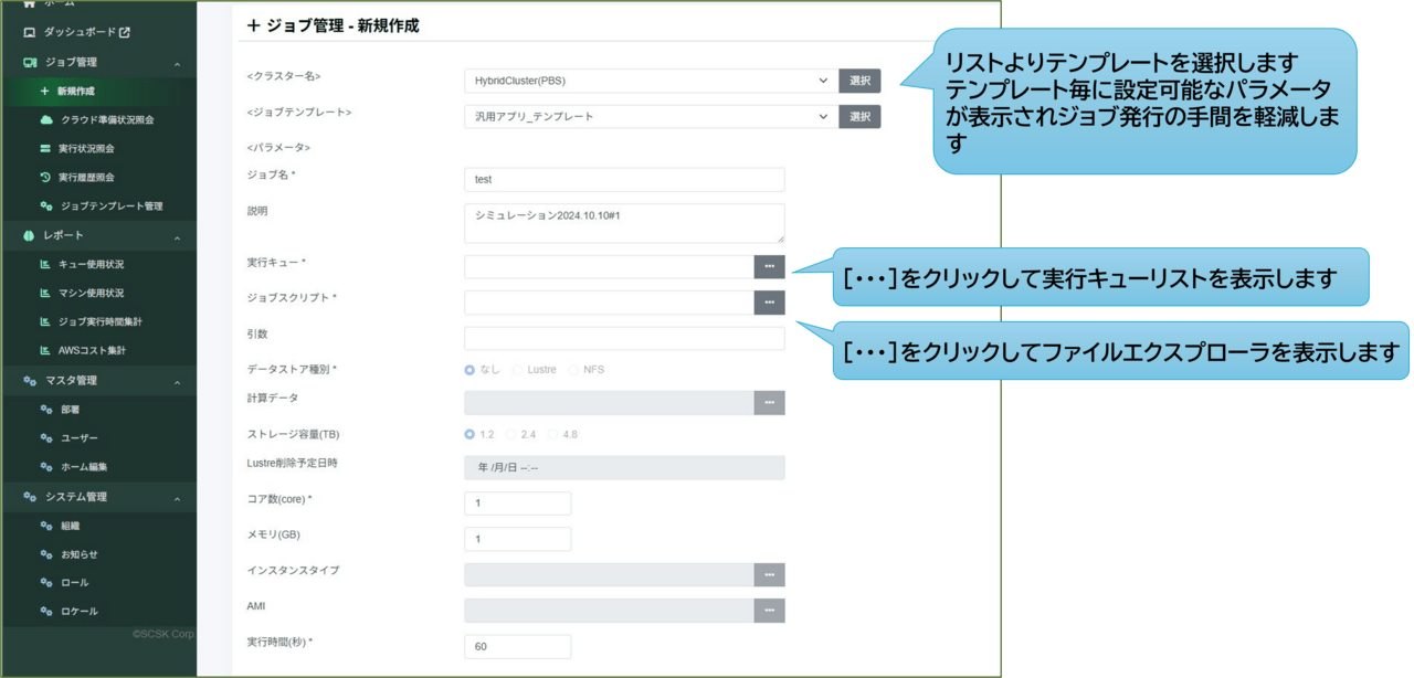 事前に定義済みのテンプレートから、GUIベースで簡単にジョブを実行できます。リストからテンプレートを選択するだけで設定可能なパラメータが表示されるため、ジョブ発行の手間を大幅に軽減します。