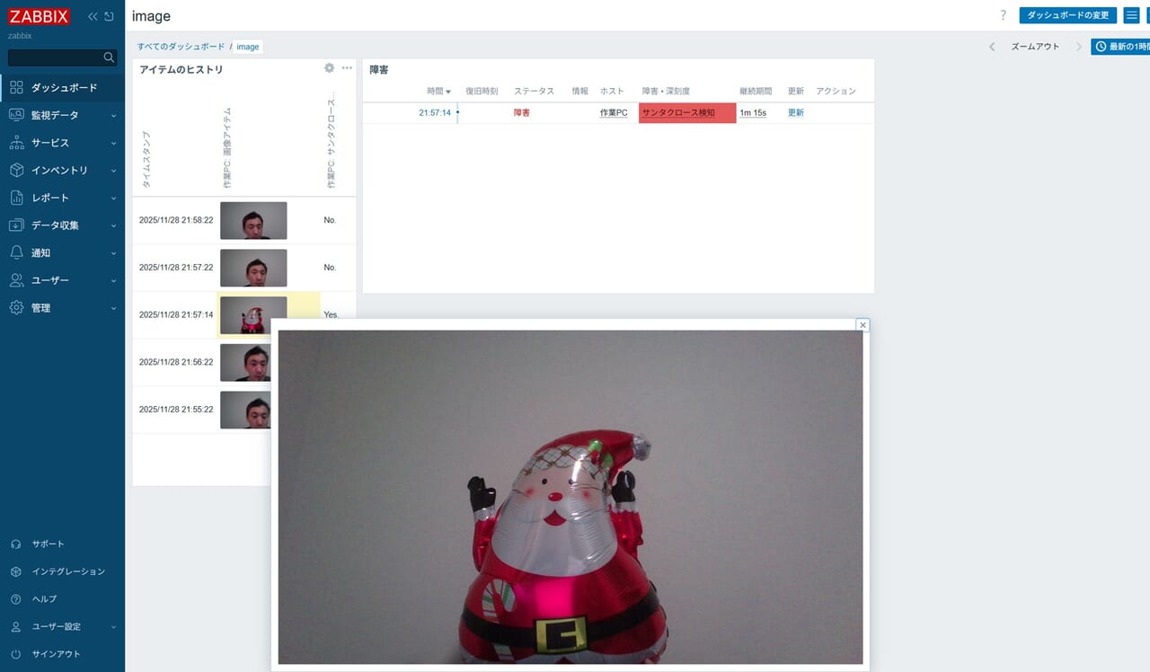 定期監視で撮影された画像がZabbix上に表示され、AI判定結果(Yes/No)が確認できます。サンタの風船を写したタイミングではAIが「YES」と回答し、トリガーが検知しました