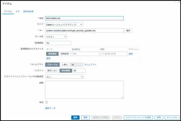 | Zabbixサーバー側 (UI) | system.run[command]キーでアイテムを作成する |