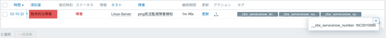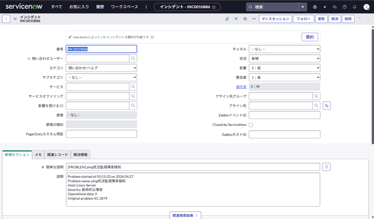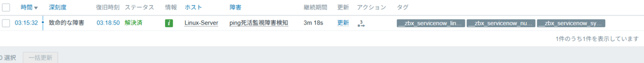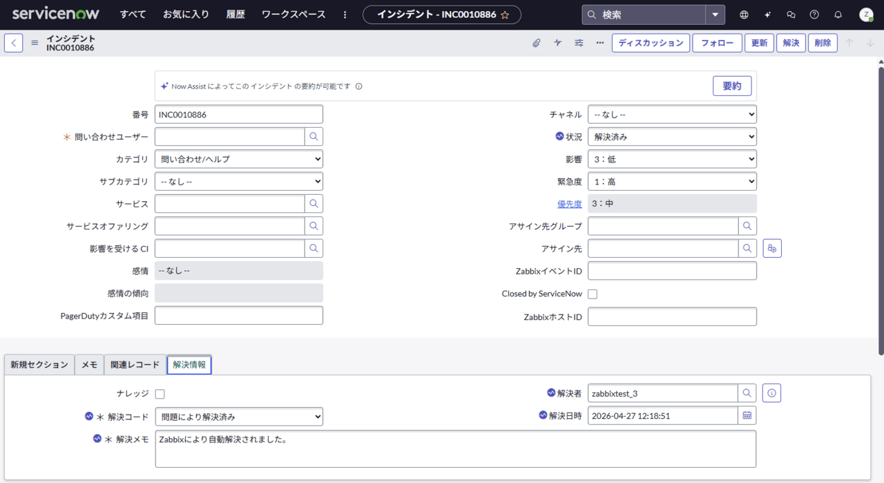 Zabbixのステータス変更に合わせて、ServiceNowのインシデントも自動でクローズされました。