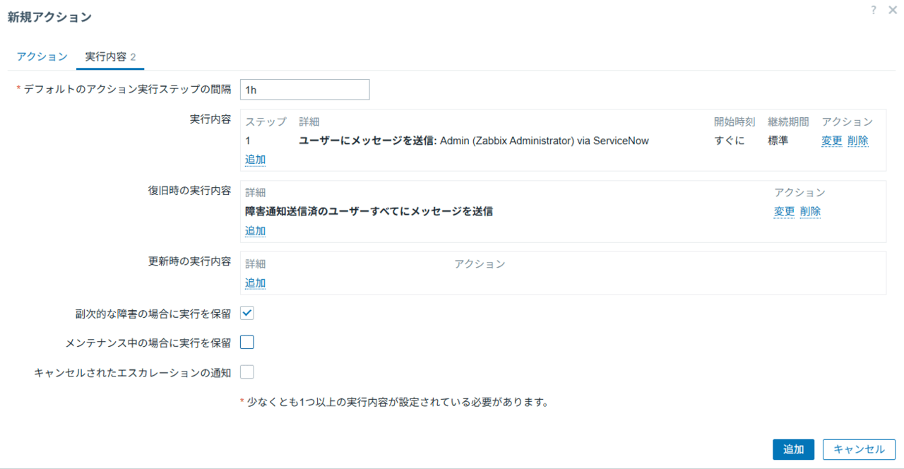 障害発生時と回復時に、対象ユーザーに対してWebhookを発行するための「アクション」を設定します。 「実行内容(障害発生時)」と「復旧時の実行内容(障害回復時)」の両方に、ServiceNowへの通知処理を組み込むのがポイントです。