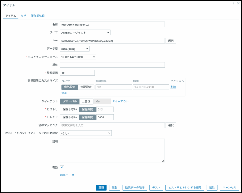 | キー | samplekey02[/var/log/work/testlog,zabbix] (引数はキー名に続けて [ ] 内に具体的な値をカンマ区切りで指定する。 $1に”/var/log/work/testlog”を、S2に”zabbix”を渡す) |