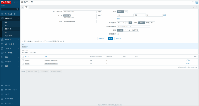 [監視データ] > [最新データ]を開き、設定したアイテムの値が定期的に更新されていることを確認してください。