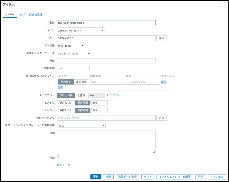 | キー | samplekey01 (zabbix_agentd.confで記載したアイテムキー) |