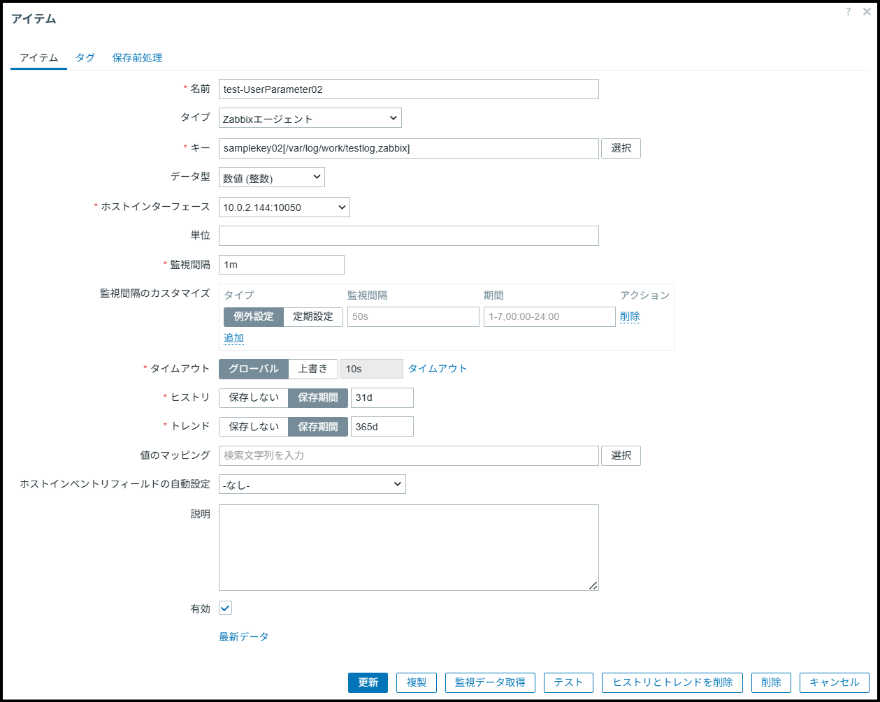 | キー | samplekey02[/var/log/work/testlog,zabbix] (引数はキー名に続けて [ ] 内に具体的な値をカンマ区切りで指定する。 $1に”/var/log/work/testlog”を、S2に”zabbix”を渡す) |