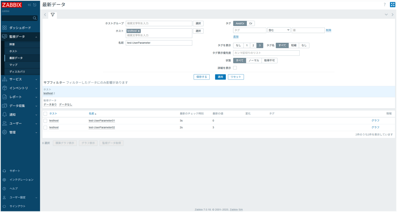 [監視データ] > [最新データ]を開き、設定したアイテムの値が定期的に更新されていることを確認してください。