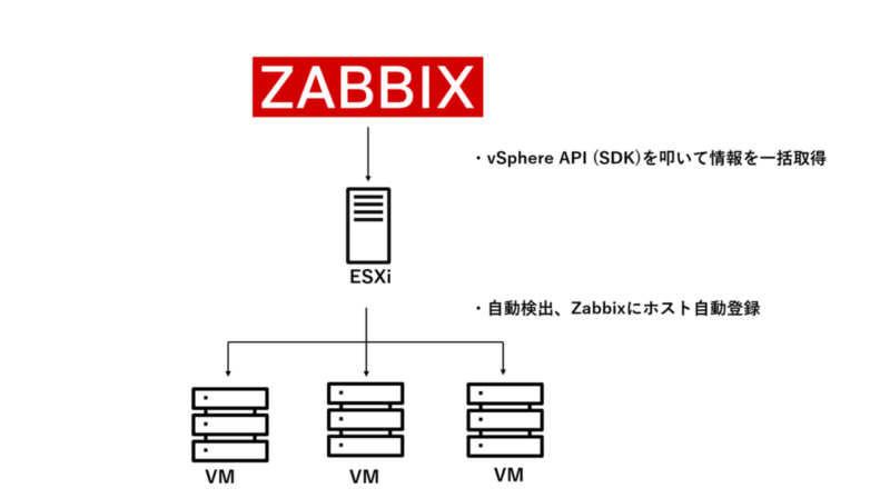 今回は検証のため、「1台のESXiホスト」を直接Zabbixに登録し、その上の仮想マシンを自動検出する方針で解説しました。