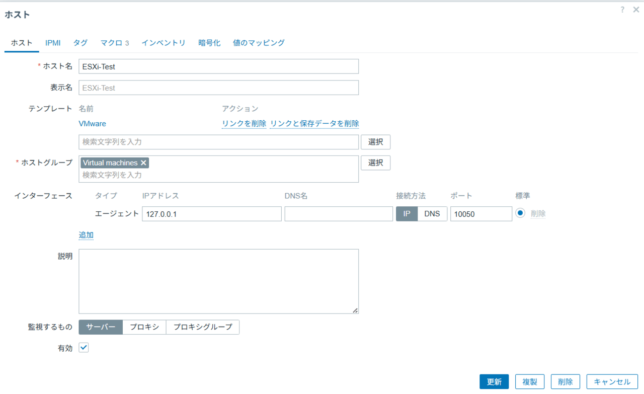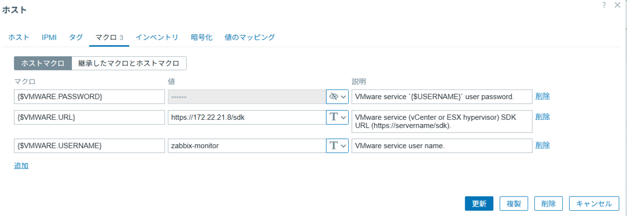 {$VMWARE.URL}:https://<ESXiのIPアドレス>/sdk{$VMWARE.USERNAME}:zabbix-monitor(先ほどESXiで作ったユーザー){$VMWARE.PASSWORD}: (設定したパスワード)