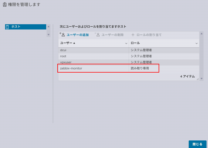 zabbix-monitorに対して 「読み取り専用 (Read-only)」 ロールを割り当てて保存します。